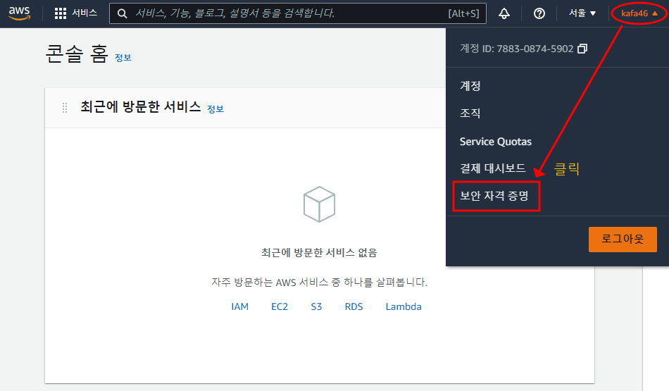 그림 Fig. 5.8같이 Amazon EC2 Console 화면 우측 상단에서 본인 아이디를 클릭하여 메뉴를 펼친 다음 보안 자격 증명 메뉴를 선택합니다.