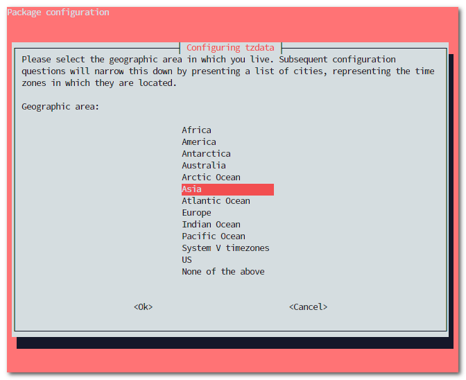 sudo dpkg-reconfigure tzdata그림 Fig. 4.5와 같은 설정창이 나타납니다.